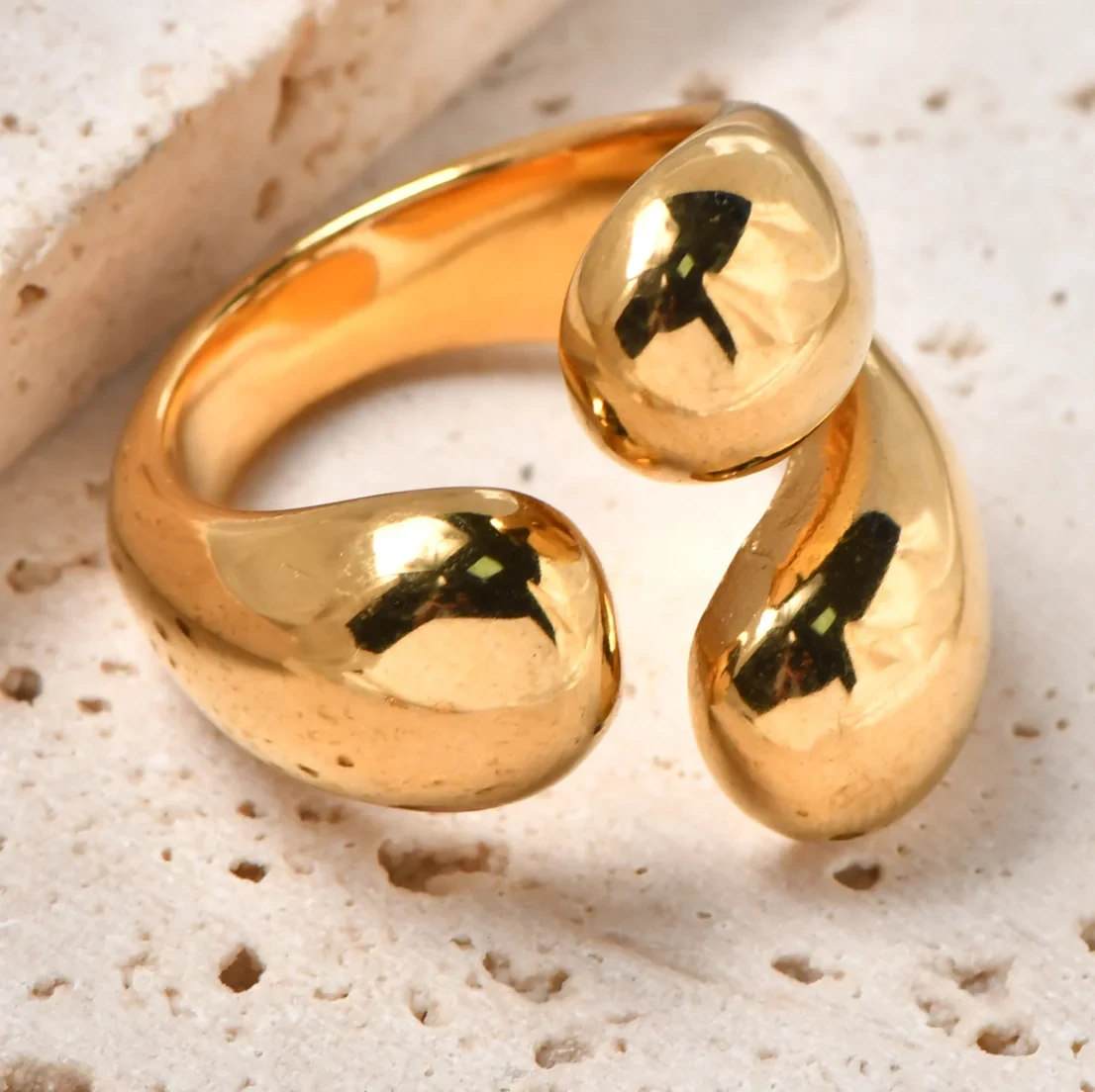 Bold, sculptural, and unapologetically fluid—the Golden Drip Ring captures the essence of molten elegance. With its smooth, droplet-inspired design, this contemporary piece wraps around the finger like flowing gold. It’s a statement of movement and modernity, perfect for those who love minimalism with a touch of edge. Wear it solo for an artful look or stack it to amplify the shine.